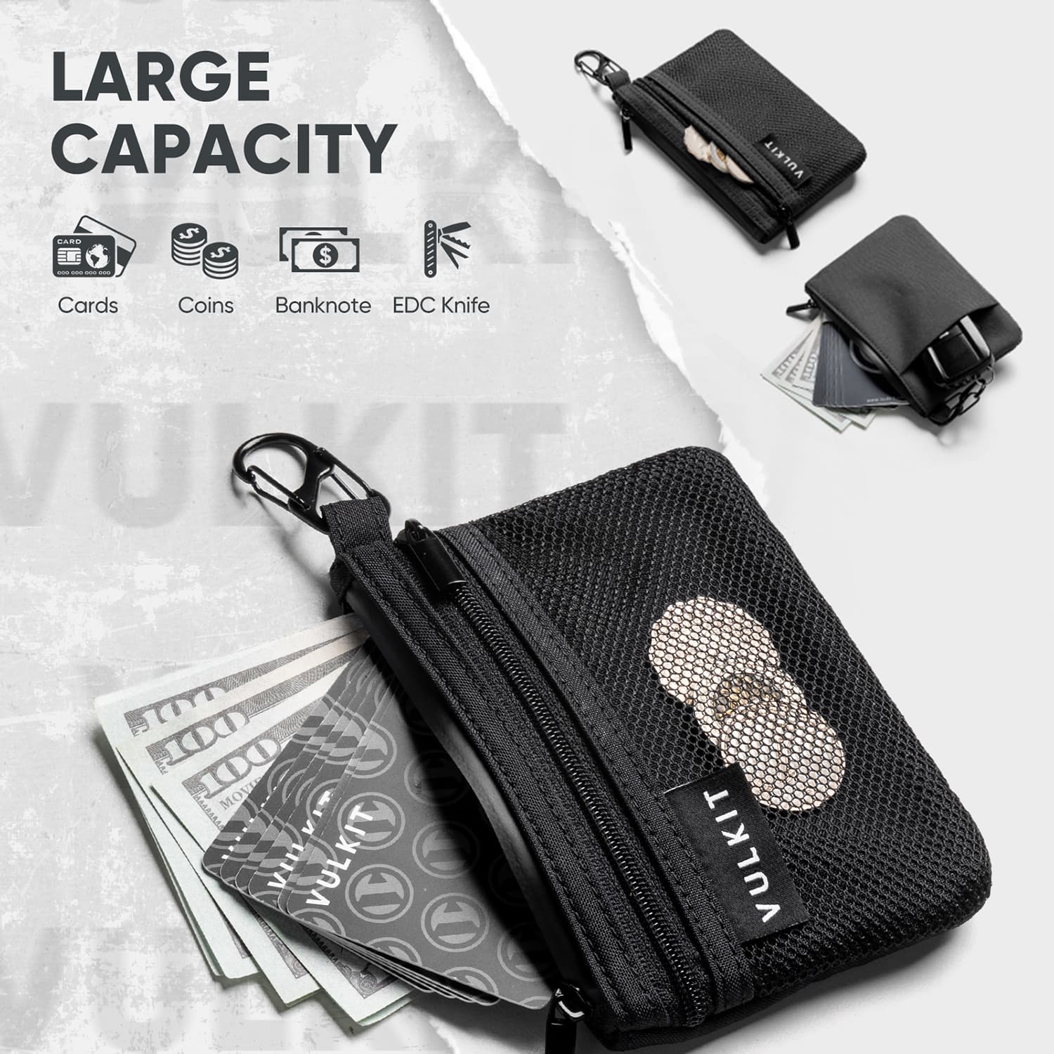 Fits in front pocket. Excellent for travel. Plenty of space to sort cash and cards