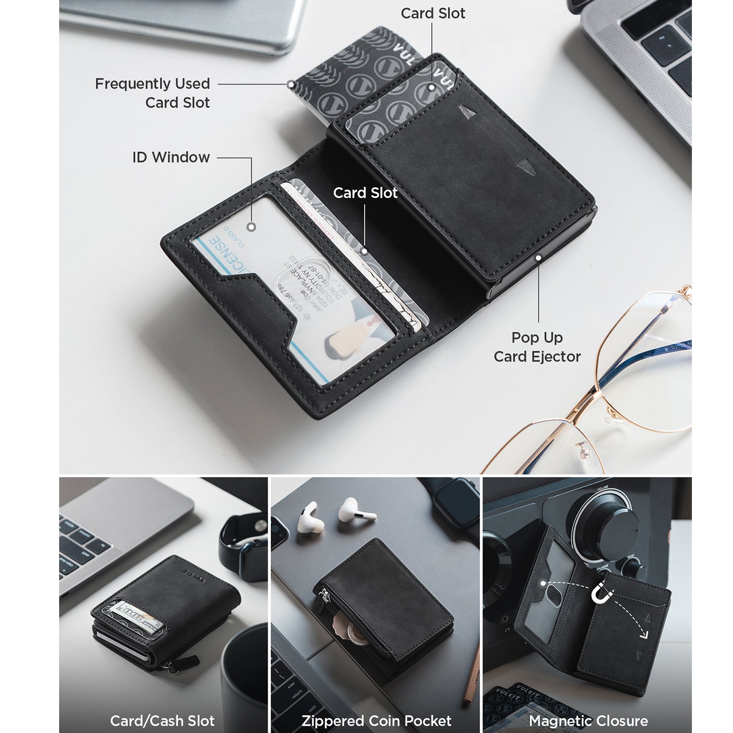 VC502 - Card Holder with Card Ejector, RFID Blocking, Zipper Coin Pocket, ID Window, and Magnetic Closure