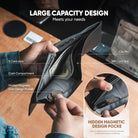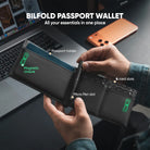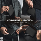 Holds your passport, boarding pass, up to 9 cards, and flat banknotes. Includes quick-access card slots, a hidden compartment, SIM card slot, and a magnetic coin pocket.