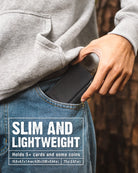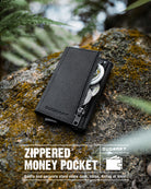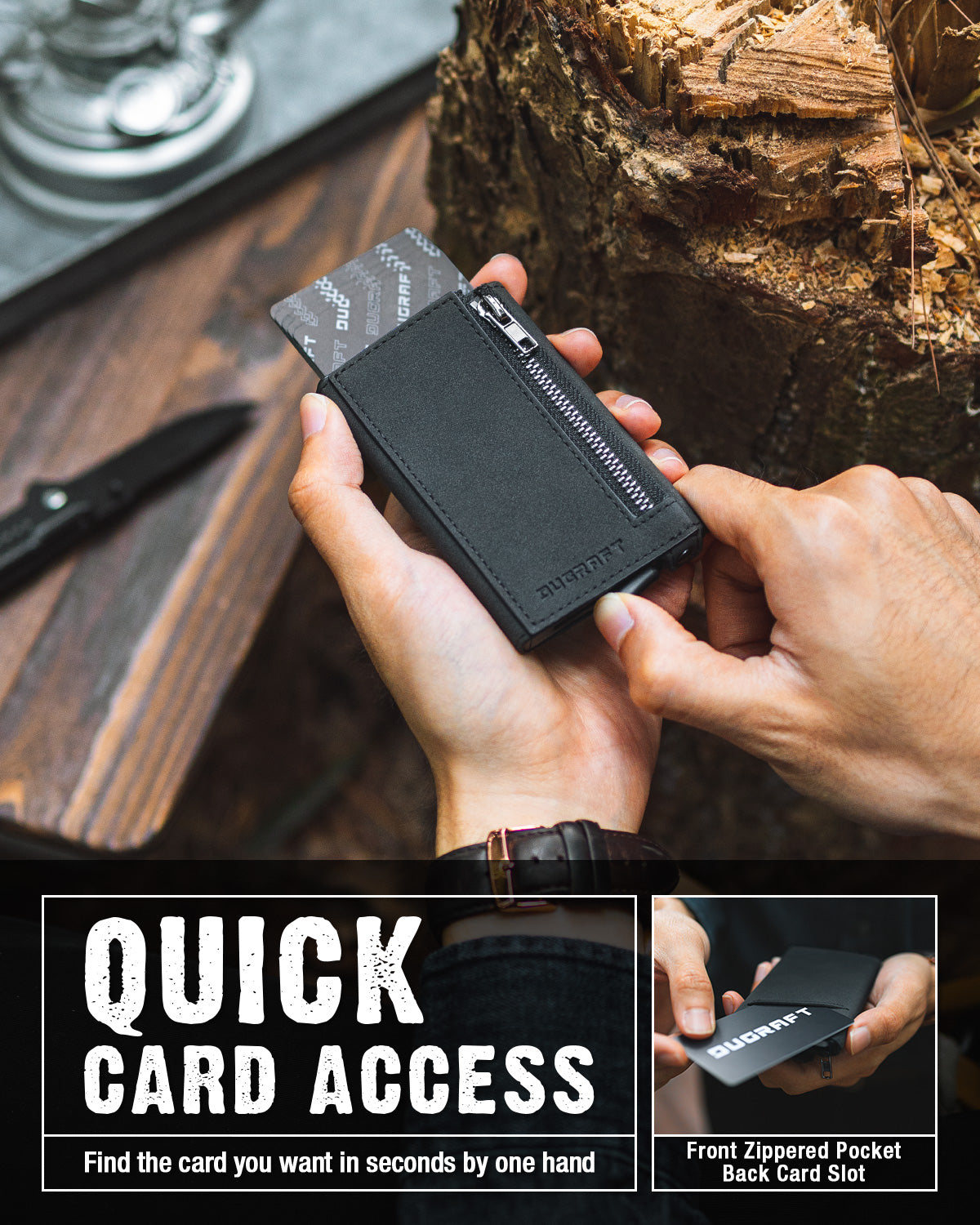 SLIM & FUNCTIONAL – Compact wallet (4.26×2.62×0.72 in) with inner aluminum card case (1–6 cards), front zip pocket (coins/AirTag) & back bill slot.
