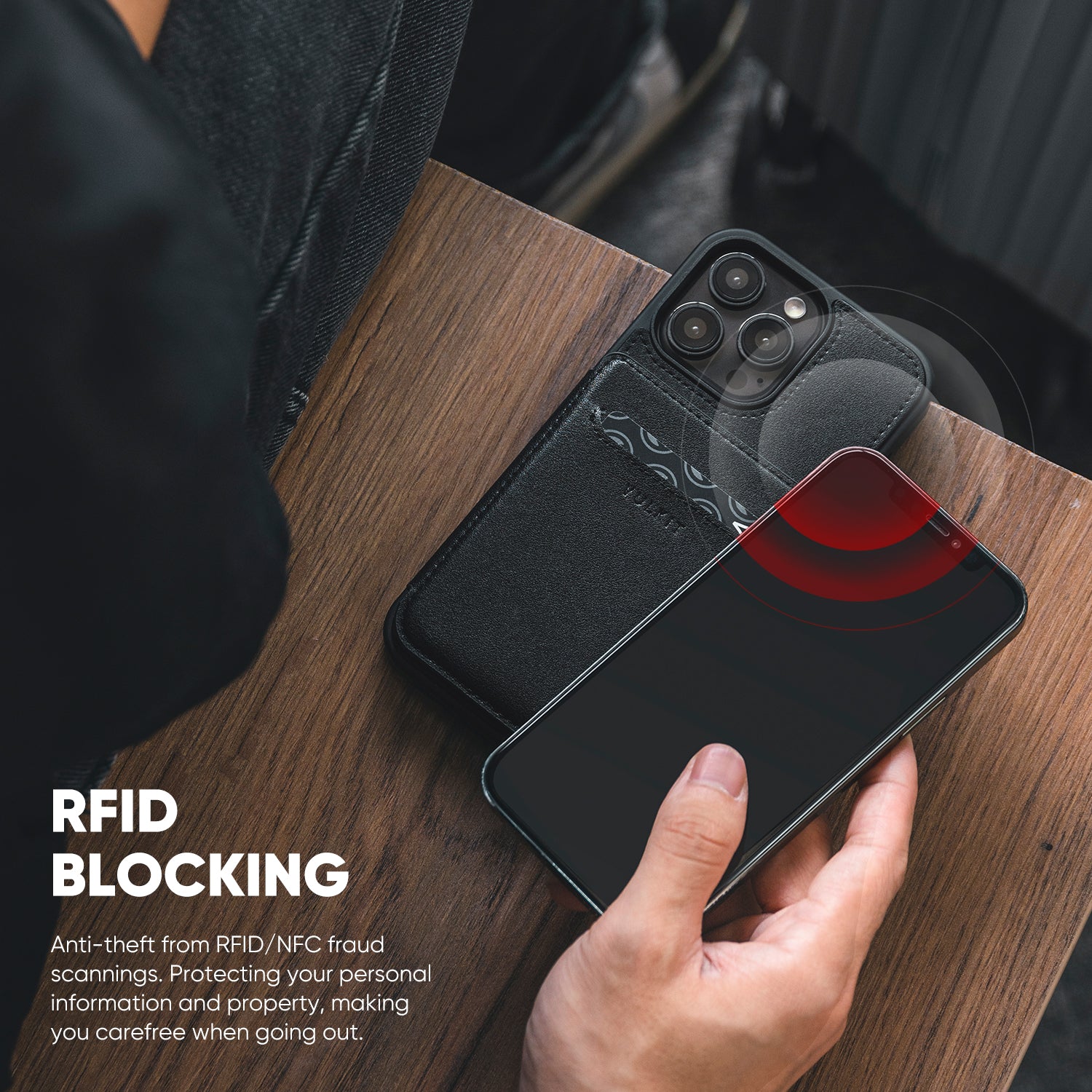 - RFID BLOCKING TECHNOLOGY: Adopting advanced RFID protection technology to protect your phone and cards on the case away from unauthorized scanning. Keeps your personal information and property secure.