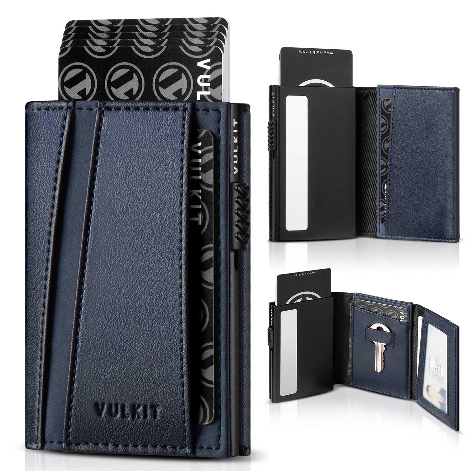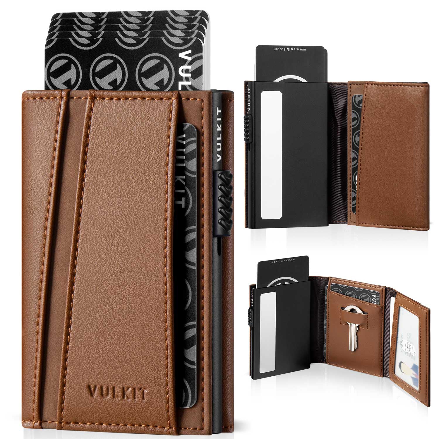 - AMPLE STORAGE CAPACITY - This VULKIT card holder stores 10 cards and some coins. The pop-up aluminum card holder stores 6-7, the built-in one key hole for your common spare key, and the ID window for driver's licenses.