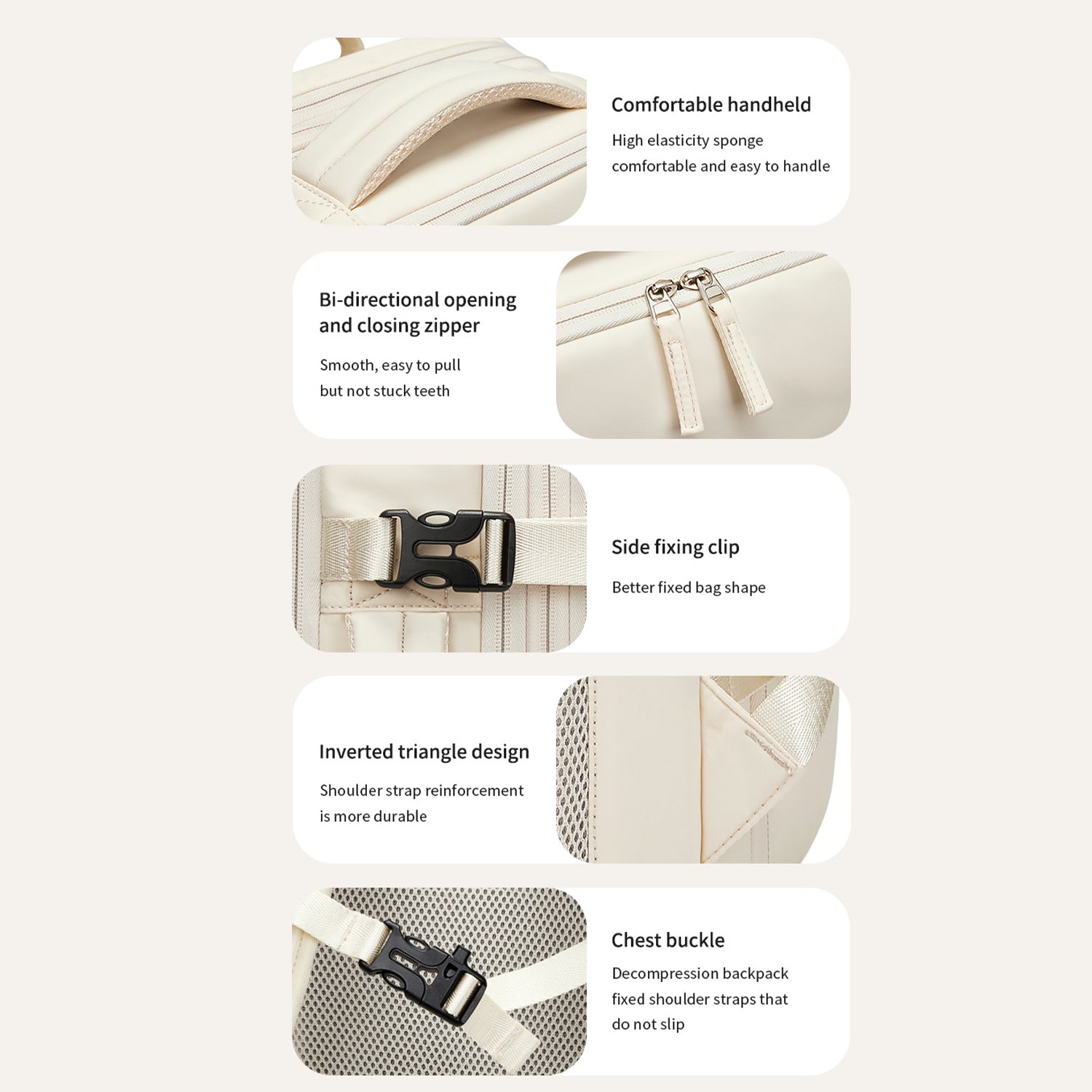 Comfort & Versatility:Breathable honeycomb back panel, reinforced padded shoulder straps, anti-slip chest strap, and dual carry modes (backpack or handbag).