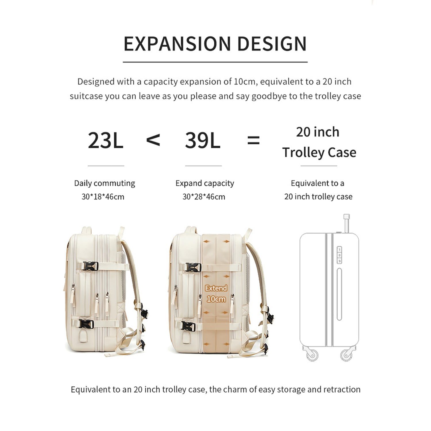 Expandable Design – From Daily to Travel-Ready:Easily switch from 23L to 39L with a single zip. Spacious enough for 5–7 days of travel, replacing your carry-on suitcase.