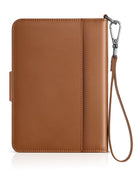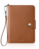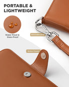 Waterproof, stain-resistant leather with a removable wrist strap and secure button closure for durability and ease.